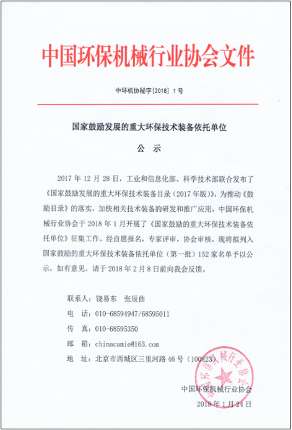 2017年12月28日,工業(yè)和信息化部、科學技術部聯(lián)合發(fā)布了《國家鼓勵發(fā)展的重大環(huán)保技術裝備目錄(2017年版)》,我司“連續(xù)吸附再生水處理裝備“入選該目錄。為推動《鼓勵目錄》落實,加快相關技術裝備的研發(fā)和推廣應用,中國環(huán)保機械行業(yè)協(xié)會于2018年1月開展了《國家鼓勵發(fā)展的重大環(huán)保技術裝備依托單位》征集工作。我司積極組織策劃,開展相關申報工作。最終,我司憑借技術優(yōu)勢,入選國家鼓勵發(fā)展的重大環(huán)保技術裝備依托單位(http://www.bjcamie.org.cn)。